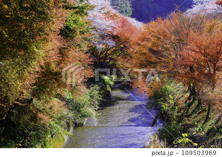 川の流れと紅葉と四季桜