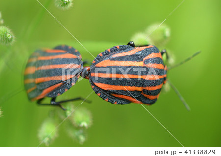 生き物 昆虫 アカスジカメムシ、サッカーのユニフォームを思わせる美しい縦縞模様です