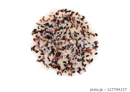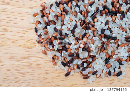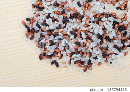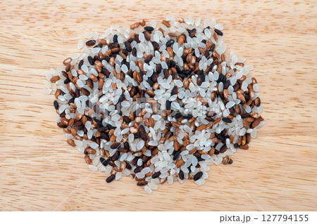 古代米3種(緑米、赤米、緑米)。有機栽培された日本産の玄米。