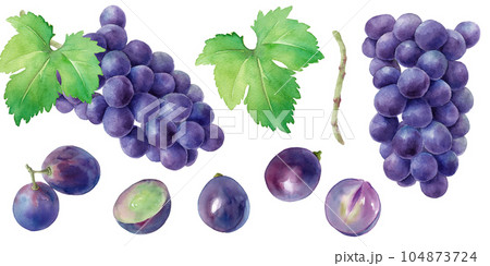 紫ブドウ(巨峰)の果実と葉の水彩イラスト。セット。