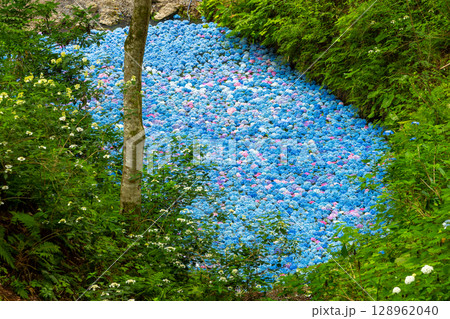 岩手県一関市舞川原沢 紫陽花の名所みちのくあじさい園 あじさい池を埋めるアジサイ水中花