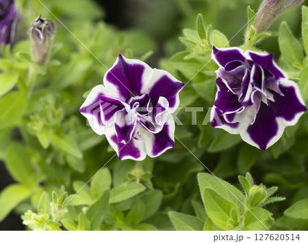 Cropped shot of woman in black gardening gloves holding Petunia flowers by roots to transplant it into ground in her garden on sunny summer day while working outdoors