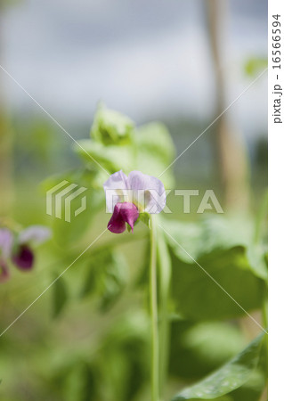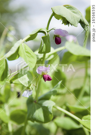 青空に映える豆の花と葉とツル、紫花豆、白花豆