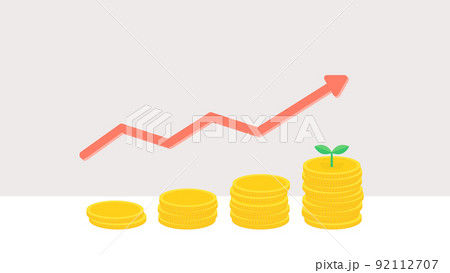 右肩上がりに増える積み重なったコイン・硬貨と赤い矢印 - 利息・増益のイメージの素材