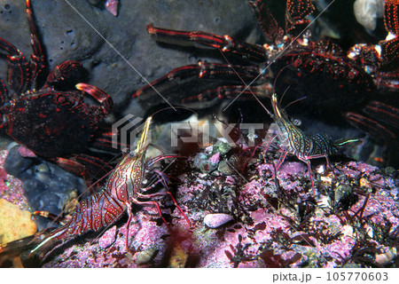 岩陰の生物 潮溜まりの岩陰 サラサエビ ショウジンガニ