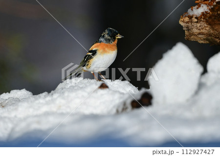 冬の山の森で出会えるオレンジ色の鮮やかな色をした美しい小鳥アトリ