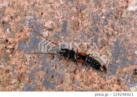 生き物 昆虫 ヒラタハネカクシ、お腹が丸出し。後翅を畳むとハサミムシのようにも見えます