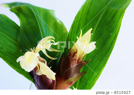 秋を呼ぶ野菜・花茗荷の実(花穂)と葉・横位置垂直アップ