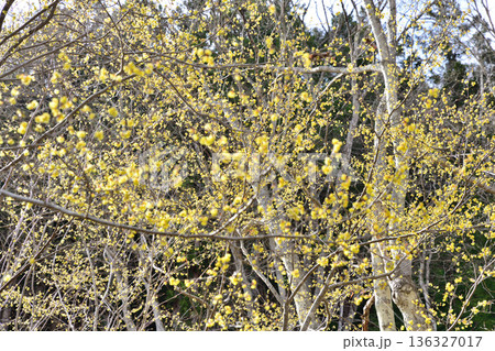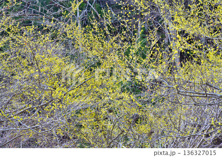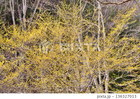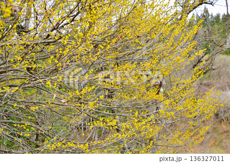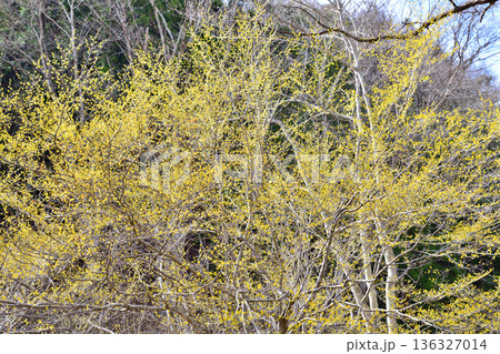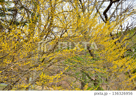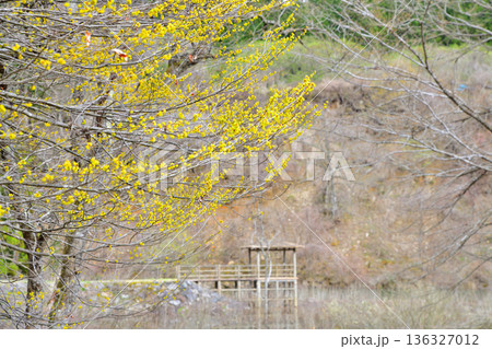 満開のサンシュウ 早春の日溜まり 赤谷湖畔