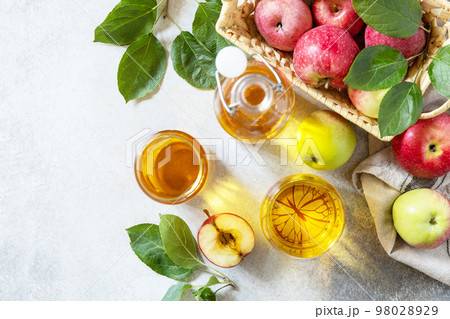 Autumn vitamin drink juice apple. Apple juice in a glass and fresh apples on a stone tabetop.