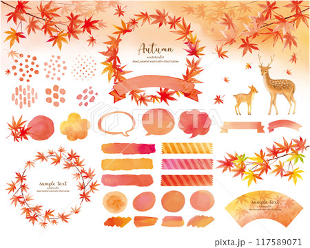 水彩で描いた秋色の可愛いテクスチャやイラストの素材セット