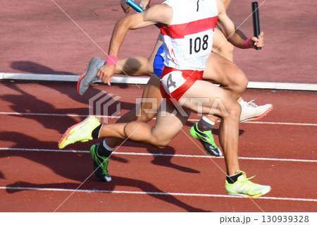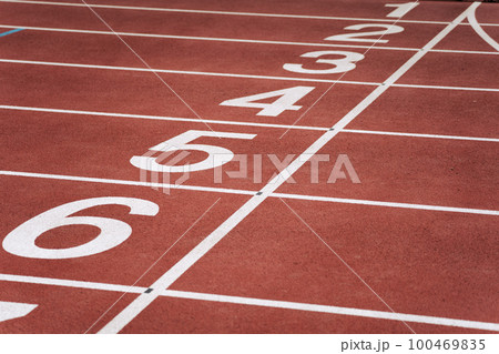 スタート!陸上短距離 トラックあり スタンド スクリーン屋根 空 雲 文字あり 他競技者あり
