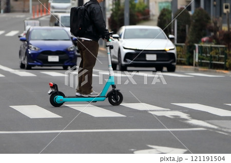 日本の東京都市景観 新宿の街中で見かけた電動キックボードシェアサービス=西新宿、8月20日