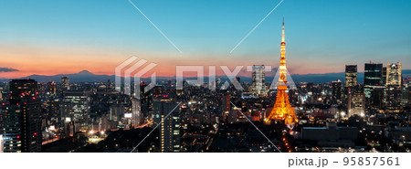 「東京都」夕暮れの都市風景と東京タワー