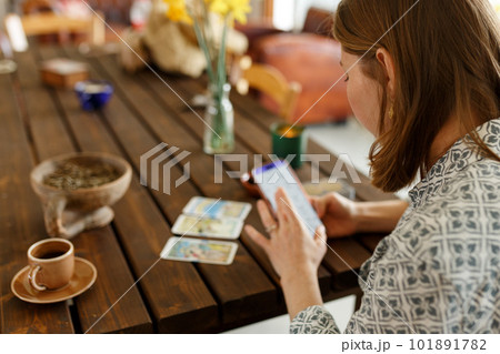 Beautiful young woman is guessing on cards with tarot, runes on wooden table and uses an online app in phone to interpret divination, home interior,candles and dry herbs..