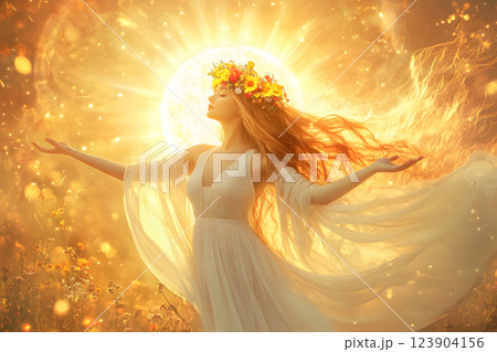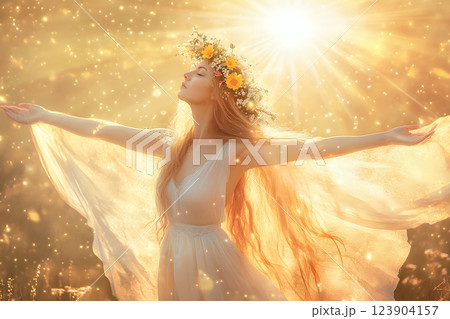 神秘的な森で光を操る女神、スピリチュアルの世界