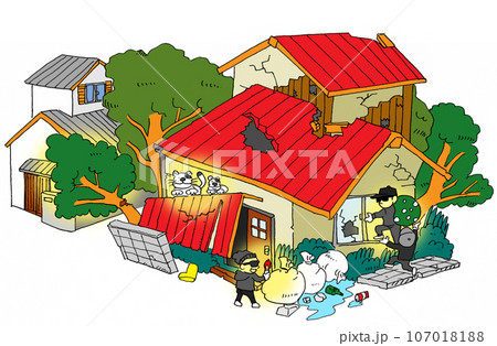 空き家問題・老朽化して様々な社会問題を起こす住宅のイラスト