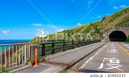 角田トンネル 角田浜から角田岬の先端に建つ角田岬灯台(新潟市西蒲区)