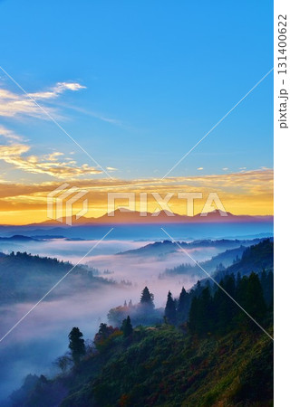 新潟県長岡市越後川口雲海朝焼けの棚田・養鯉池越後三山雲海の夜明け