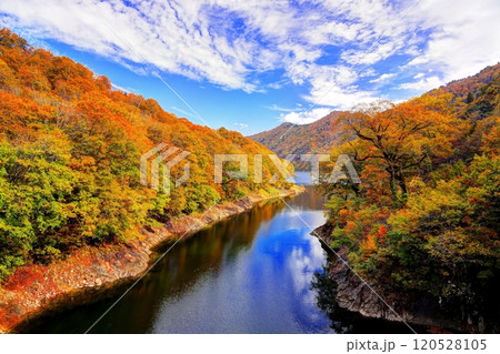 新潟県南魚沼市 十字峽 紅葉の岩壁と渓流