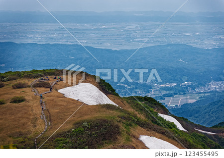初夏の守門岳山頂から見る青雲岳と長岡方面の街並み