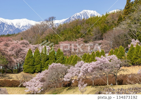 長野県上伊那郡飯島町で見る中央アルプスと桜(仙涯嶺・越百山)