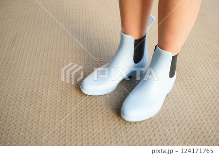 ショート丈のキッズ用レインブーツ。小学5年生の女の子が水色のレインブーツを履いている足元。