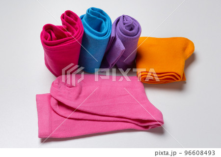 Assortment of socks of different colors, several twisted and the rest partially folded, on a white background