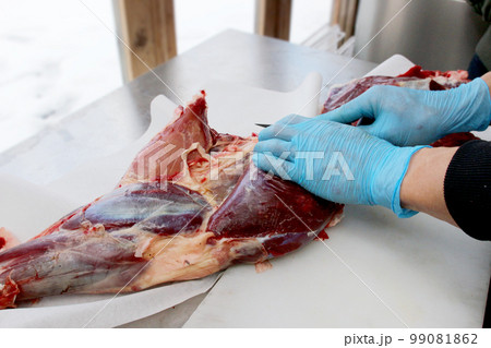 鹿肉を解体する男性の手元 ジビエ 狩猟 プロ さばく 精肉