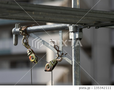 工事現場の足場に付けられた滑車