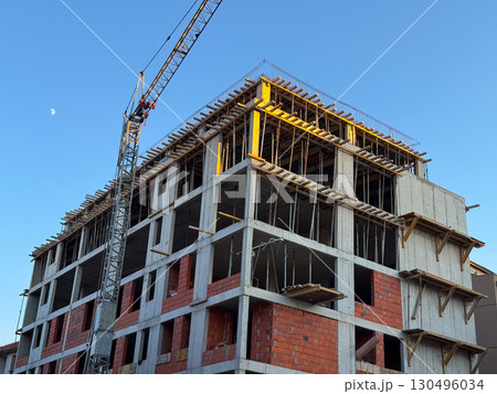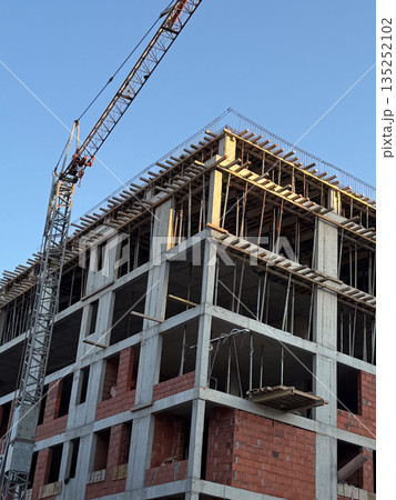 Concrete building under construction with crane and visible framework. Architecture, engineering, and urban development process in progress within a modern residential project.