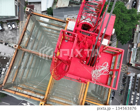 建設現場の荷揚げ機と仮設足場