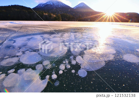 オンネトー湖のアイスバブルと雌阿寒岳・阿寒富士