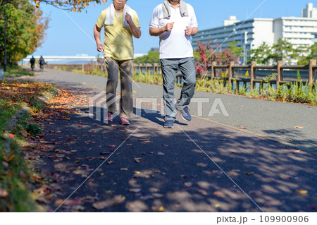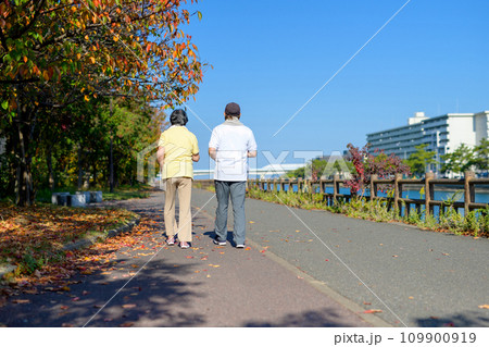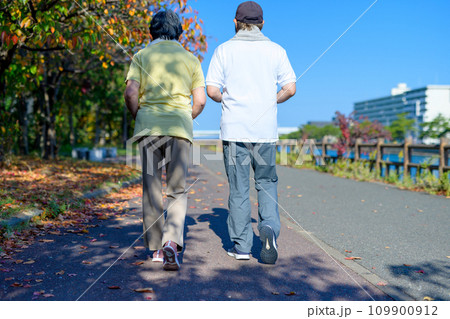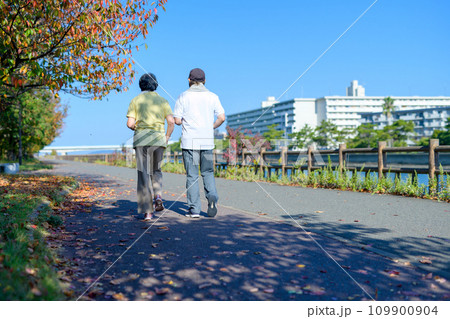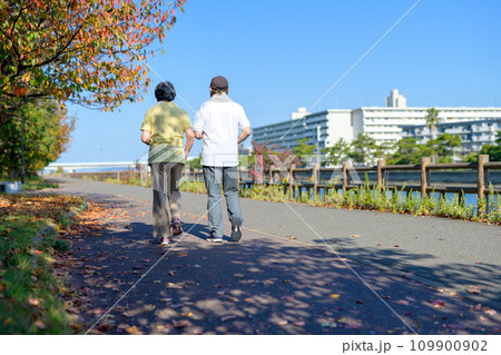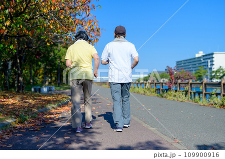 健康のためにウォーキングするアクティブシニアの男女夫婦 ダイエット 運動 健康習慣 トリミングアップ