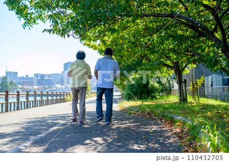 健康のためにウォーキングするアクティブシニアの男女夫婦 ダイエット 運動 散歩 逆光 朝カラー