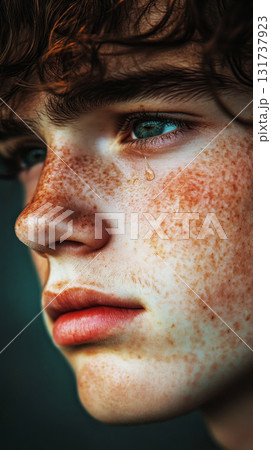 The vulnerable teenager, lost in thought, stares into the distance with a tear on their cheek, soft natural light emphasizing the tender depth of their emotion