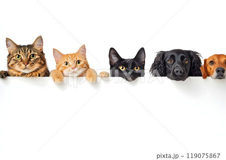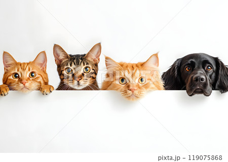 猫と犬が壁の上から並んで顔だけのぞかせているかわいいペットの集合写真