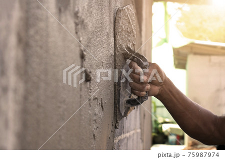Close-up of workers using plaster trowel for plastering for house construction. Concepts of house extension.