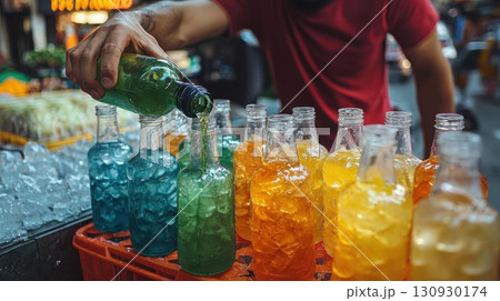 Street Vendor Pouring Colorful Drinks Vietnam.