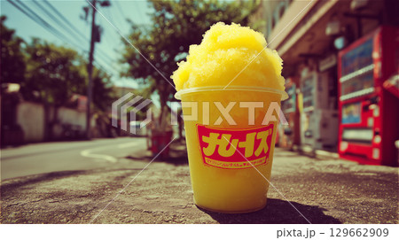 夏の日本の路上に置かれた、黄色いシロップがかかったカップ入りのかき氷