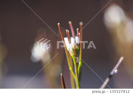 早春の野原に咲く白い小さなナズナの花