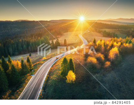 Aerial view from drone of rural road leading through autumn forests and groves in yellow green colors. Dense forest in golden time and empty highway in fall season. Roadway among colorful treetops