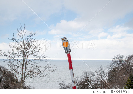 冬の知床 フクロウの路肩ポールとオホーツク海の流氷 (北海道・斜里町・岩尾別)