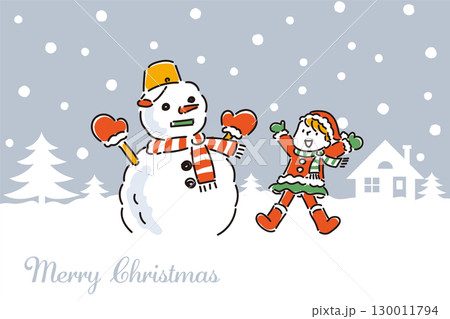 大きな雪だるまを作って喜ぶ子どものポストカード