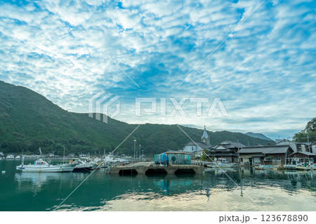 熊本県天草市 世界文化遺産に登録された天草の崎津カトリック教会の朝の海からの眺め
