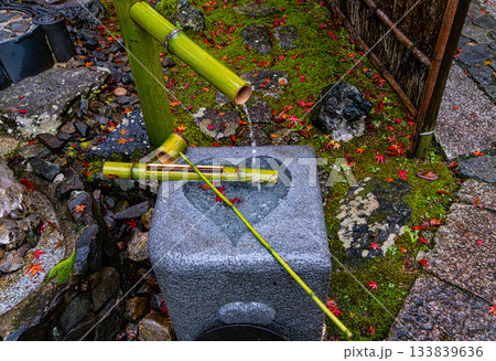 秋の京都 西陣興聖寺 紅葉に包まれた降り蹲踞