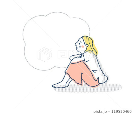 膝を抱えて泣いている女性とふきだし