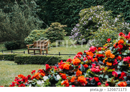 Park bench surrounded by vibrant flowers and lush greenery. Sustainable landscaping, eco-friendly gardens, native plants, and biodiversity in modern design.