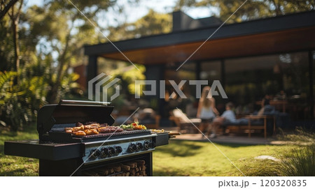 Friends enjoy a lively barbecue in a beautiful backyard surrounded by greenery, with a modern home in the background, capturing the essence of a perfect sunny day.