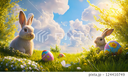 AI-generated content. Cheerful Easter Bunny Enjoying Bright Spring Day. cute Easter bunny sits among painted eggs and blooming flowers on sunny day. Easter egg hunt